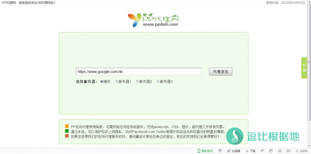 登陆网站页面,输入目标站点,部分站点为避免出错要去掉网址中包含的http://,但支持输入https://,服务器选择随机,如果没有随机选项那就自己选择一个服务器,然后点击代理浏览