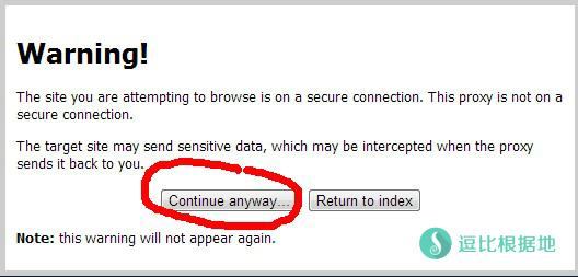 连接服务器成功后浏览器会弹出一个不安全连接警告,无视它,点击continiu anyway…