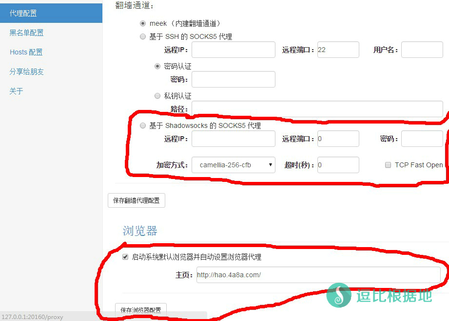 点击左上角的代理配置后会看到如下图第一个红圈所示的“基于shadowsocks的sock5代理”选项,选择此项并填写你的SS账号可以直接让内置的浏览器调用你的SS代理,而不需要开shadowsocks,非常方便,TCP FAST OPEN不建议勾选