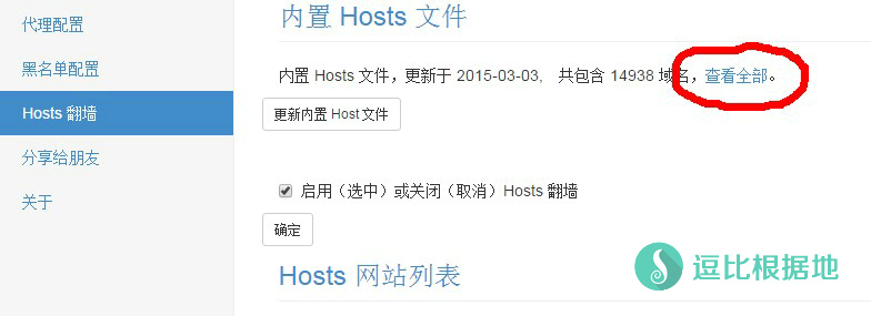 如果选择左边的hosts配置(如下图所示)你可以点击查看全部选项,然后复制hosts列表到自己的系统或分享给别人