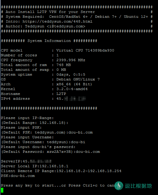 Please input IP-Range: (Default Range: 192.168.18): #输入本地IP段范围(本地电脑连接到VPS后给分配的一个本地IP地址),直接回车意味着输入默认值192.168.18 Please input PSK: (Default PSK: teddysun.com): #PSK意为预共享密钥,即指定一个密钥将来在连接时需要用到,直接回车意味着输入默认值teddysun.com Please input Username: (Default Username: teddysun): #Username意为用户名,即第一个默认用户。直接回车意味着输入默认值teddysun Please input teddysun’s password: (Default Password: Q4SKhu2EXQ): #输入用户的密码,默认会随机生成一个10位包含大小写字母和数字的密码,当然你也可以指定密码。 ServerIP:your_server_main_IP #显示你的 VPS 的主 IP(如果是多 IP 的 VPS 也只显示一个) Server Local IP:192.168.18.1 #显示你的 VPS 的本地 IP(默认即可) Client Remote IP Range:192.168.18.2-192.168.18.254 #显示 IP 段范围 PSK:teddysun.com #显示 PSK Press any key to start…or Press Ctrl+c to cancel #按下任意按键继续,如果想取消安装,请按Ctrl+c键
