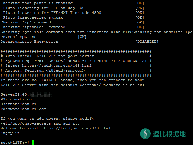 If there are no [FAILED] above, then you can connect to your L2TP VPN Server with the default Username/Password is below: ServerIP:your_server_IP PSK:your PSK Username:your usename Password:your password If you want to add users, please modify /etc/ppp/chap-secrets and add it. Welcome to visit https://teddysun.com/448.html Enjoy it!