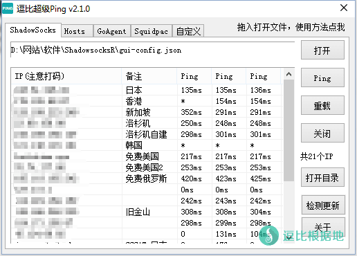 这个软件的主要作用就是批量Ping IP,是一个科学上网的辅助工具,通过得出的结果(延迟)判断出哪个账号可以用,哪个延迟低,从而省力的不需要一个一个Ping。