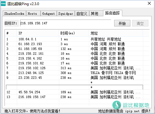 - 路由追踪输入IP,然后点击 [开始] 即可。