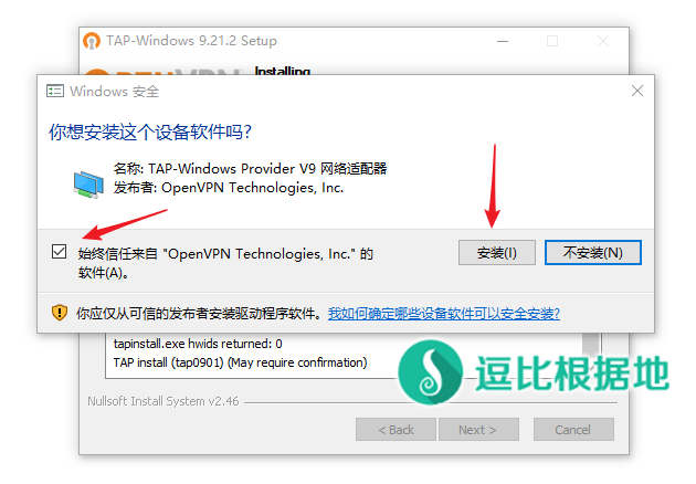 然后就会开始安装了,安装期间会提示你添加虚拟网卡,勾选 始终信任来自 xxxx 的软件 ,并点击 安装 按钮即可。