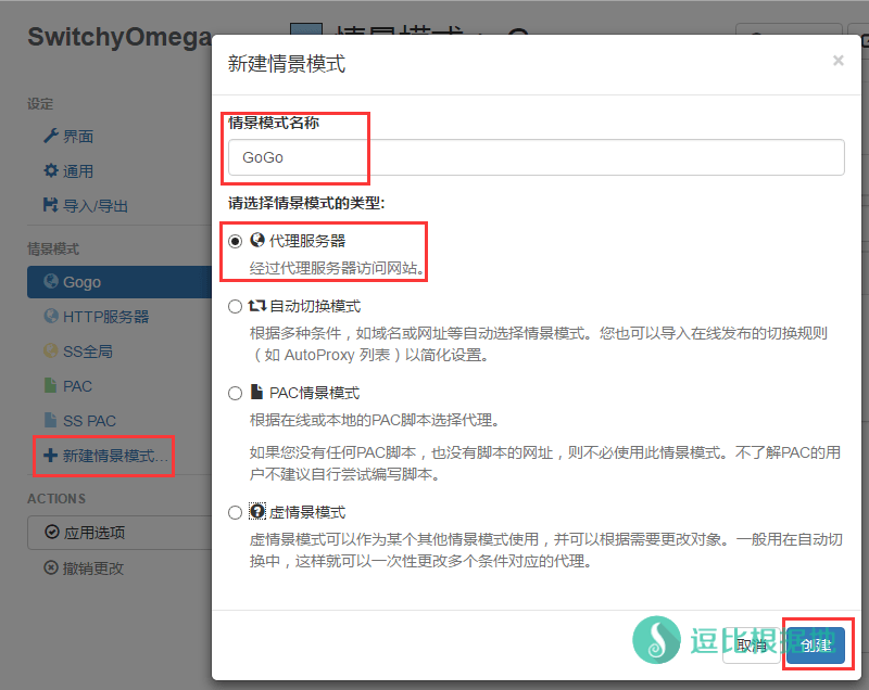 安装完毕这个插件后,点击浏览器扩展页面的 选项按钮 进入管理页面,点击左边侧栏的 新建情景模式 ,然后输入 情景模式名称 并选择 代理服务器,然后点击创建。