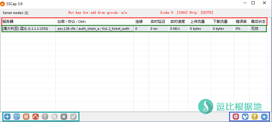 底部左边青框为 服务器操作按钮,功能分别是 手动添加 / 从二维码添加 / 从json格式配置文本添加 / 从SS/SSR链接添加 / 激活服务器 / 编辑服务器 / 删除服务器 / 检测服务器。
