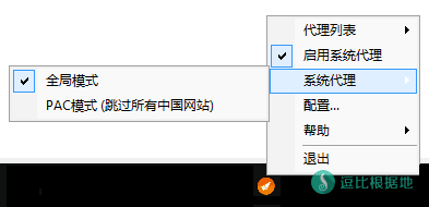 然后再点击 启动系统代理,最后再 系统代理中 选择 全局模式或PAC模式(跳过所有中国网站)。