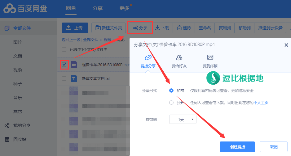 进入你的 百度网盘,然后找到你要下载的文件或文件夹,然后点击 分享 按钮,分享形式建议加密,至于有效期如果不需要经常下载那么设置 1天 就行了,免得时间长了分享了一堆文件,然后点击 创建链接 按钮。