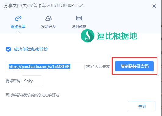 创建链接后,我们直接点击 复制链接及密码 按钮,然后就可以关闭百度云页面了。