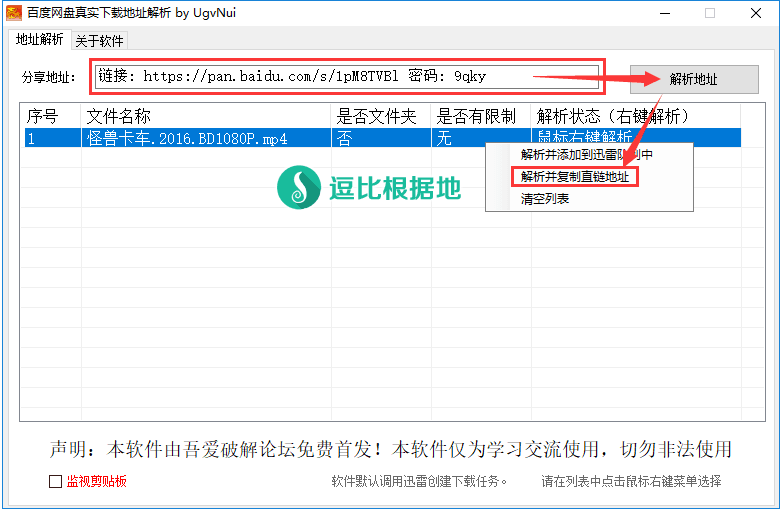我们打开刚才下载的 百度云.exe 文件,然后如下图所示,粘贴刚才复制的链接信息到输入框内,然后点击 解析地址 按钮。