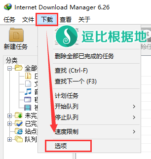 打开 IDM 软件后,点击顶部菜单栏 下载 – 选项 。
