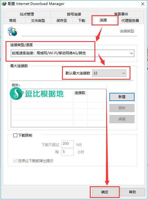 点击 连接 选项卡,连接类型/速度选择:较高速率链接… ,最大连接数根据情况选择:16/24/32 ,然后点击 确定 按钮。