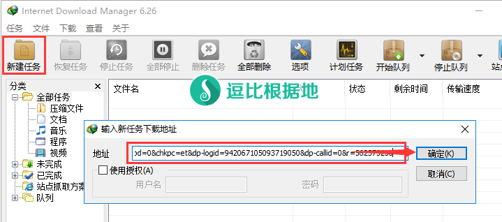 配置后,我们就可以新建任务了,点击 IDM 窗口上的 新建任务 按钮,因为前面我们已经复制了 真实下载链接,所以 IDM自动从剪辑板中提取了下载链接,我们只需要点击 确定 按钮即可。