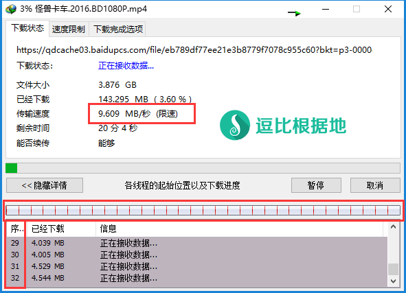 最后,我们就会看到如下图所示的下载界面了,我设置的是 32线程,最高速度能跑到 9MB/s,当然速度并不是很稳的,忽快忽慢的,平均 5-6 MB/s 还是有的,总归这个速度我已经满足了。