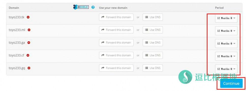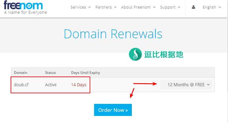 然后我们就会进入该域名的续订页面,点击右边的列表框,选择要续订的时间(默认是 1个月,图中我选择了 12个月),最多12个月,免费。