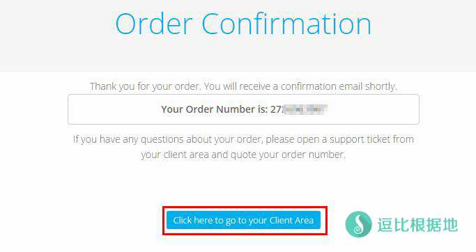 完成订单后就会给出订单号,然后点击下面的Click here to go to your Client Area按钮进入客户中心。