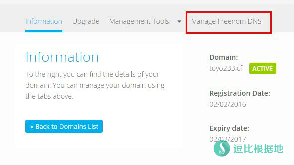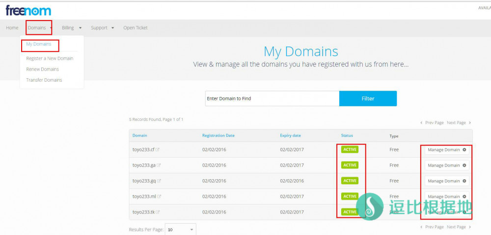 可以看到你购买的免费域名都是激活状态,点击后面的Manage Domain可以设置域名解析和DNS服务器。