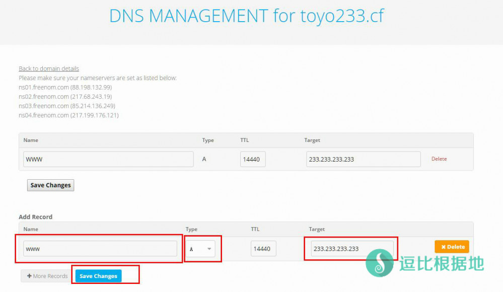 在Name中填写域名记录(比如@是toyo233.cf、www是www.toyo233.cf等等),Type(类型)根据主机空间商提供的方式选择(如果给你的是一个独立ip那就选A记录,如果是个ipv6的ip那就选AAAA记录,如果是一个共享IP或者域名那就选CNAME记录),在Target中填写主机空间商提供的IP或者域名,然后点击Save Changes保存。如果想要添加更多请点More Records按钮。