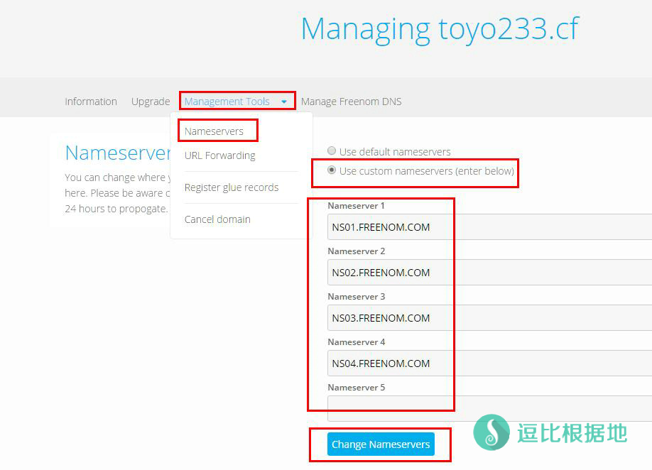 在Management Tools——Nameserver中可以更改DNS服务器,Use custom nameservers (enter below)是自定义DNS服务器,改完之后点Change Nameservers保存。(切记不要短时间内多次更换dns,容易导致一些解析问题!)