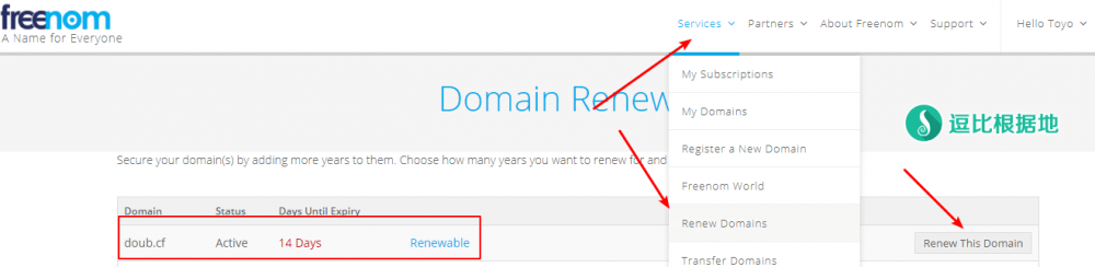 首先我们登陆进去后台:https://my.freenom.com/ ,然后点击 Services – Renew Domains 后进入域名续订页面。