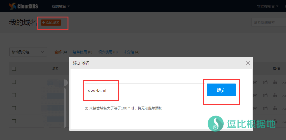 准备工作都准备好了之后,我们先去CloudXNS添加一个要接管的域名。以下都以 dou-bi.ml 为例!