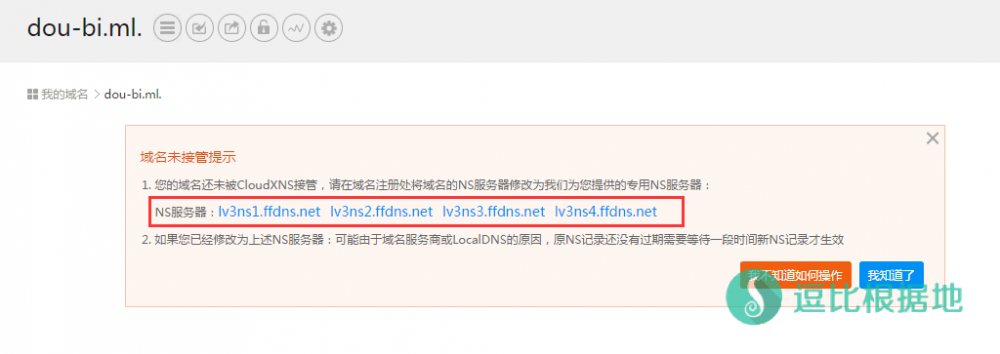 然后就会提示你域名未被接管,让你去域名管理处(Freenom)修改DNS为CloudXNS的DNS。