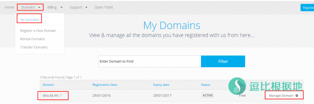 然后我们去Freenom域名管理处(Domains=> My Domains),找到你要 接管的域名(dou-bi.ml) ,点击最后的 Manage Domain 。