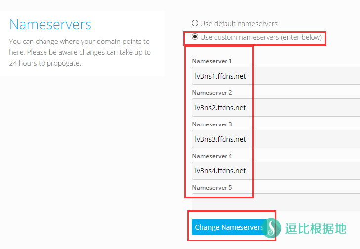 在打开的新页面 翻到下面,找到菜单栏 Management Tools中的 Namesevers,如下图所示,选择第二个自定义DNS服务器,并把默认的DNS改成上面 CloudXNS提醒你要修改的四个DNS服务器。然后点Change Nameserver保存。
