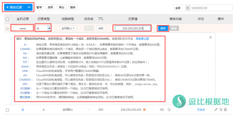 具体的记录类型和记录值 解释,可以看下图,CloudXNS解释的很清楚了。