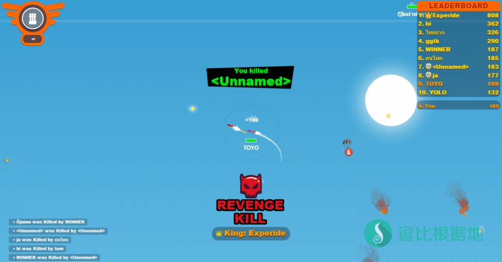不断的攻击其他玩家获得积分,同时注意地图上回从天上飘下来一些弹药包,吃了之后会转变攻击方式(导弹、散弹、电击、冲撞等)