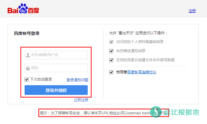 就会跳转到百度账号授权页面,就像QQ登录那样,输入账号密码并不会泄露,可以看浏览器地址栏URL。