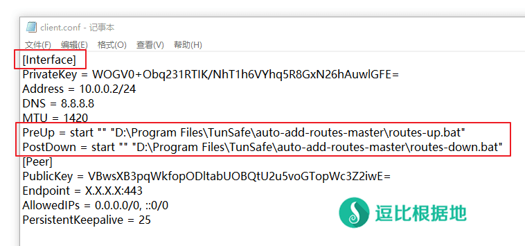 PreUp = start "" "D:/Program Files/TunSafe/auto-add-routes-master/routes-up.bat" PostDown = start "" "D:/Program Files/TunSafe/auto-add-routes-master/routes-down.bat" # 自行修改 D:/Program Files/TunSafe/auto-add-routes-master 为你的文件路径。