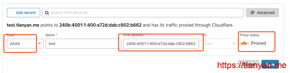 - 登录cloudflare,添加ipv6解析到vps的ipv6地址: